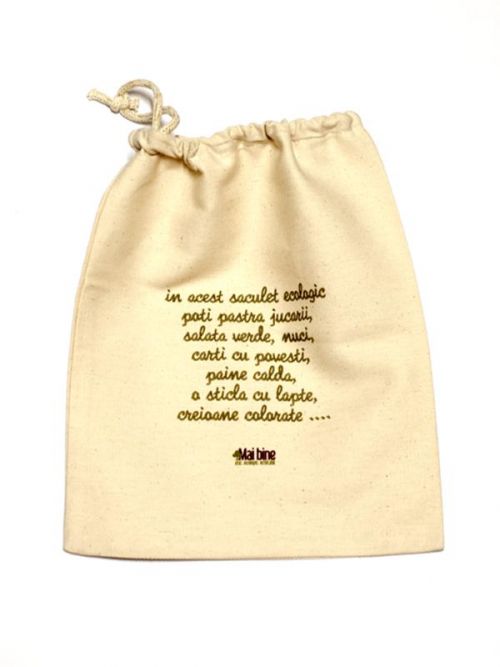 Saculet eco "diverse"Postat de: Asociatia Mai Bine Descriere produs: Săculeţi din bumbac netratat, de purtat la cumpărături sau la plimbare. Sunt rezistenţi şi încăpători, numai buni pentru încărcat cu fructe parfumate sau flori de pus la uscat peste iarnă, pentru ceaiuri, sau orice mai vrei tu. |