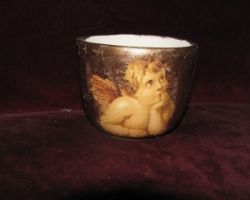 Pahar mic rotund din material ceramic pictat,realizat prin tehnica servetelului.Pret 4 ron.