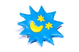 O stea veselă, în culori complementare, care poate fi purtată la o hăinuţă la fel de veselă. Este o broşă lucrată cu mult drag, din fimo.