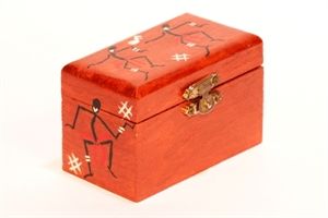 O cutie din lemn desenat cu modele tribale simpatice, un loc numai bun unde să stea câteva perechi de cercei, un inel şi un colier. Dimensiunile sunt cam de 6 x 10 cm.