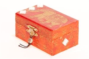 O cutie din lemn cu aplicaţie în model indian. Este suficient spaţiu pentru câteva bijuterii preţioase. Dimensiunile sale sunt 5 x 10 cm.