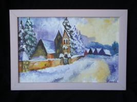 "Iarna" pictat in tempera pe carton, rama din plastic. Dimensiuni 150x 100 mm
