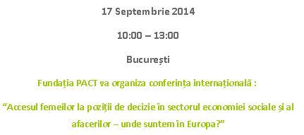 Pe 17 Septembrie 2014, intre orele 10:00 -13:30, in Bucuresti, la Hanul lui Manuc, etajul 2, Sala Voievodala, Fundatia PACT va organiza conferinta internationala “Accesul femeilor la pozitii de decizie in sectorul economiei sociale si al afacerilor – Unde suntem in Europa?”, in cadrul proiectului "Oportunitati de gen in contextul mediului de afaceri si al antreprenoriatului social", finantat prin programul PROGRESS al UE.
