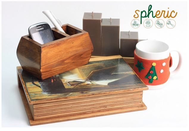 Pe site-ul www.spheric.ro gasiti cutii pentru sticle de vin, huse facute frumos de mana pentru cani, cutie pentru plicurile de ceai decorata manual, globuri din materiale textile realizate manual si multe altele. Cele mai multe pot fi si personalizate cu logo-ul firmei.