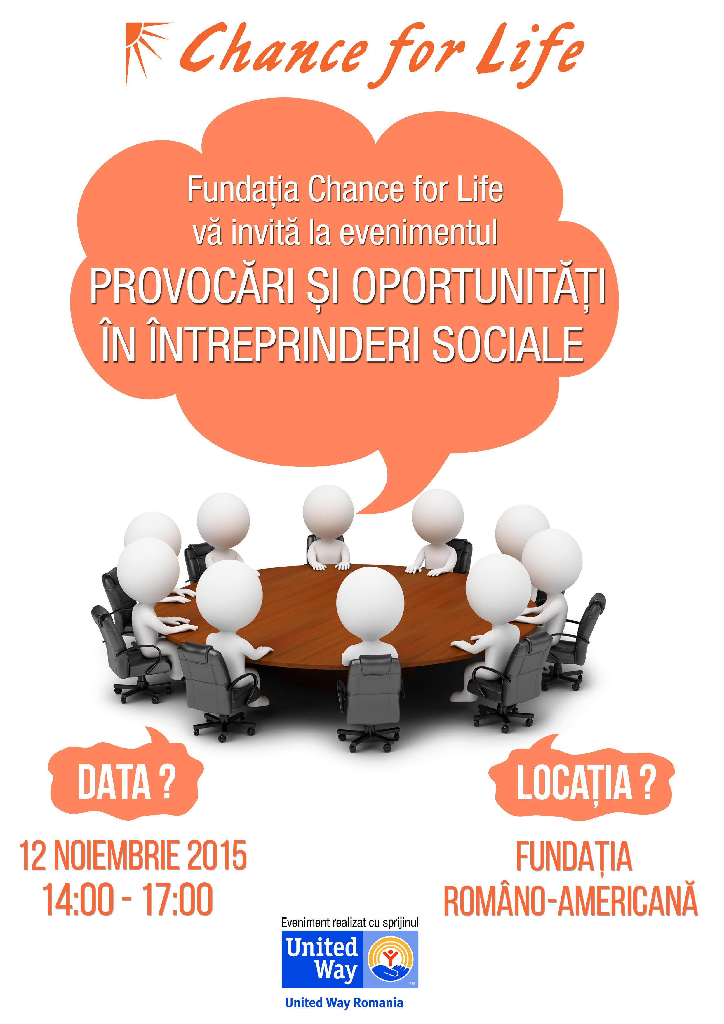 Fundatia Chance for Life va invita pe 12 noiembrie 2015, intre orele 14 - 17, la Evenimentul "Provocari si Oportunitati in Intreprinderi Sociale", organizat de Fundatia Chance for Life cu sprijinul United Way.
