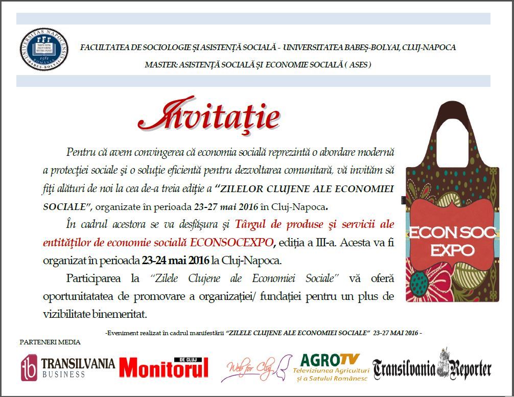Facultatea De Sociologie si Asistenta Sociala - Universitatea Babes-Bolyai, Cluj-Napoca va invita in Cluj-Napoca in perioada 23-27 Mai 2016 la "Zilele Clujene ale Economiei Sociale", din convingerea ca economia sociala reprezinta o abordare moderna a protectiei sociale si o solutie eficienta pentru dezvoltarea comunitara.