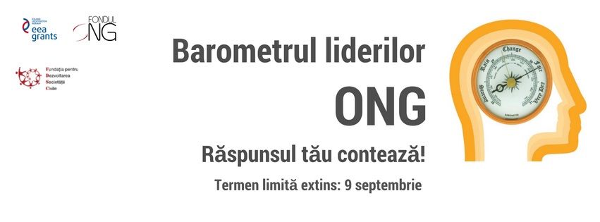 Pentru a putea oferi sansa cat mai multor colegi intorsi din vacanta sa contribuie cu raspunsuri la Barometrul Liderilor ONG pentru anul 2016, am decis sa prelungim termenul de completare a chestionarului online pana vineri, 9 septembrie 2016.