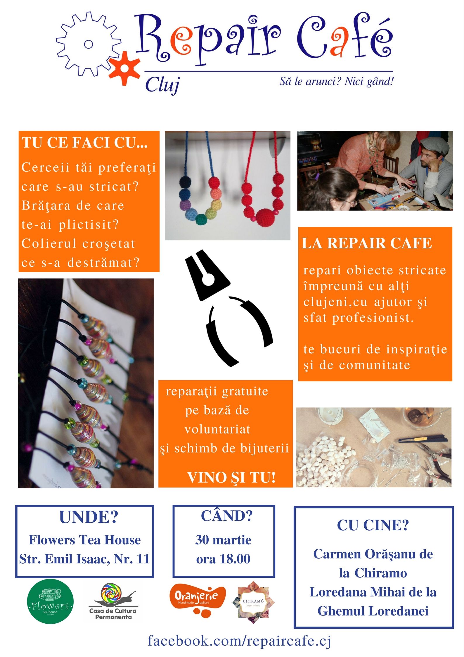 Bijuteriile ne coloreza momente din viata. Ne aduc culoare, delicatete, simplitate si eleganta. Dar ce faci cand cerceii tai preferati s-au stricat? Dar cu colierul de care te-ai plictisit ce se intampla? Noi speram ca nu le-ai aruncat si avem o invitatie pentru tine! Pe 30 martie, Repair café Cluj in parteneriat cu Orangerie te invita la un eveniment de reparatii si schimb de bijuterii, la Flowers Teahouse, incepand cu orele 18.