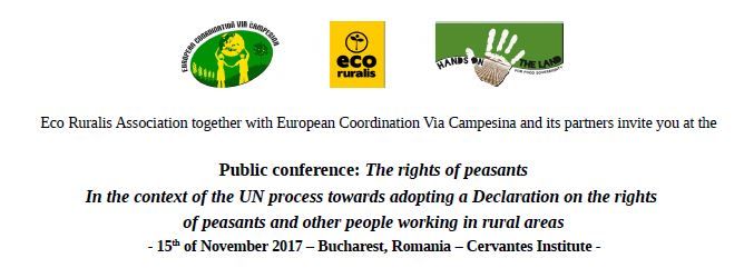 Toti cei interesati sunt invitati la evenimentul "Drepturile taranilor in contextul procesului ONU in vederea adoptarii Declaratiei privind drepturile taranilor si a altor persoane care lucreaza in mediul rural", care va avea loc pe 15 noiembrie 2017, in Bucuresti, Romania la Institutul Cervantes - Blv. Regina Elisabeta nr. 38. Conferinta va reuni experti romani si internationali intr-un schimb de opinii cu factorii de decizie relevanti.