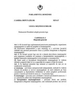 "Legea mestesugurilor" este un proiect de lege adoptat recent de catre Senatul Romaniei si care in prezent este trimis comisiilor permanente ale Camerei Deputatilor pentru raport. Atat proiectul de lege, cat si anexele unde sunt prevazute meseriile ce vor putea fi practicate de mestesugari pot fi gasite pe site-ul oficial al Camerei Deputatilor.