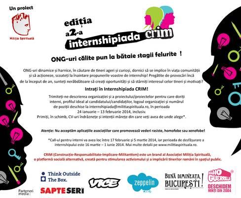 A doua editie a Internshipiadei CRIM coopteaza toate ONG-urile din tara care au nevoie de interni sau voluntari pentru proiecte specifice. In urma experientei unei editii care a adus laolalta 50 de tineri si 20 de ONG-uri si a fost un succes incontestabil, Asociatia Militia Spirituala continua Internshipiada si o duce cu un pas mai sus, la nivel national.